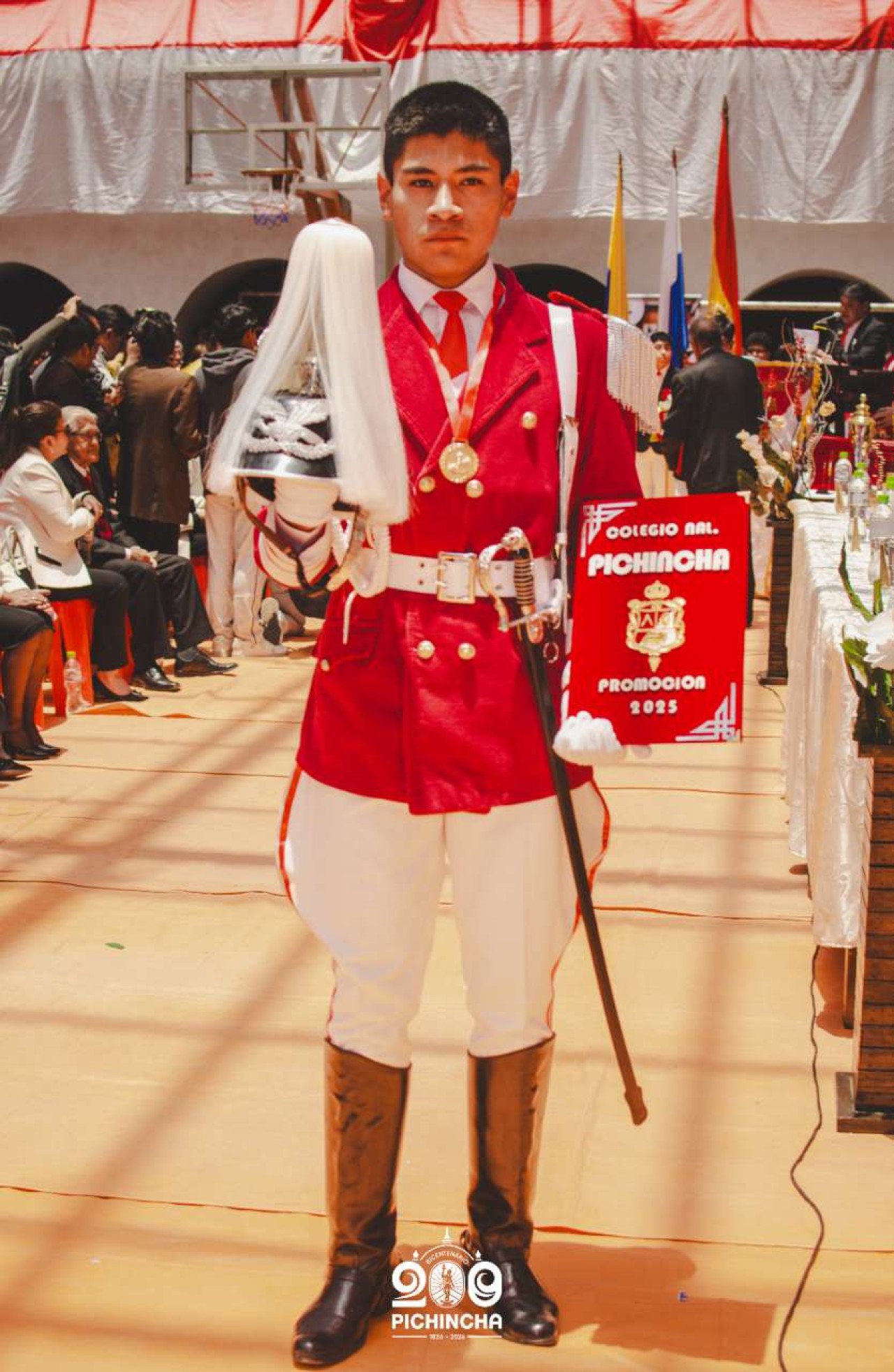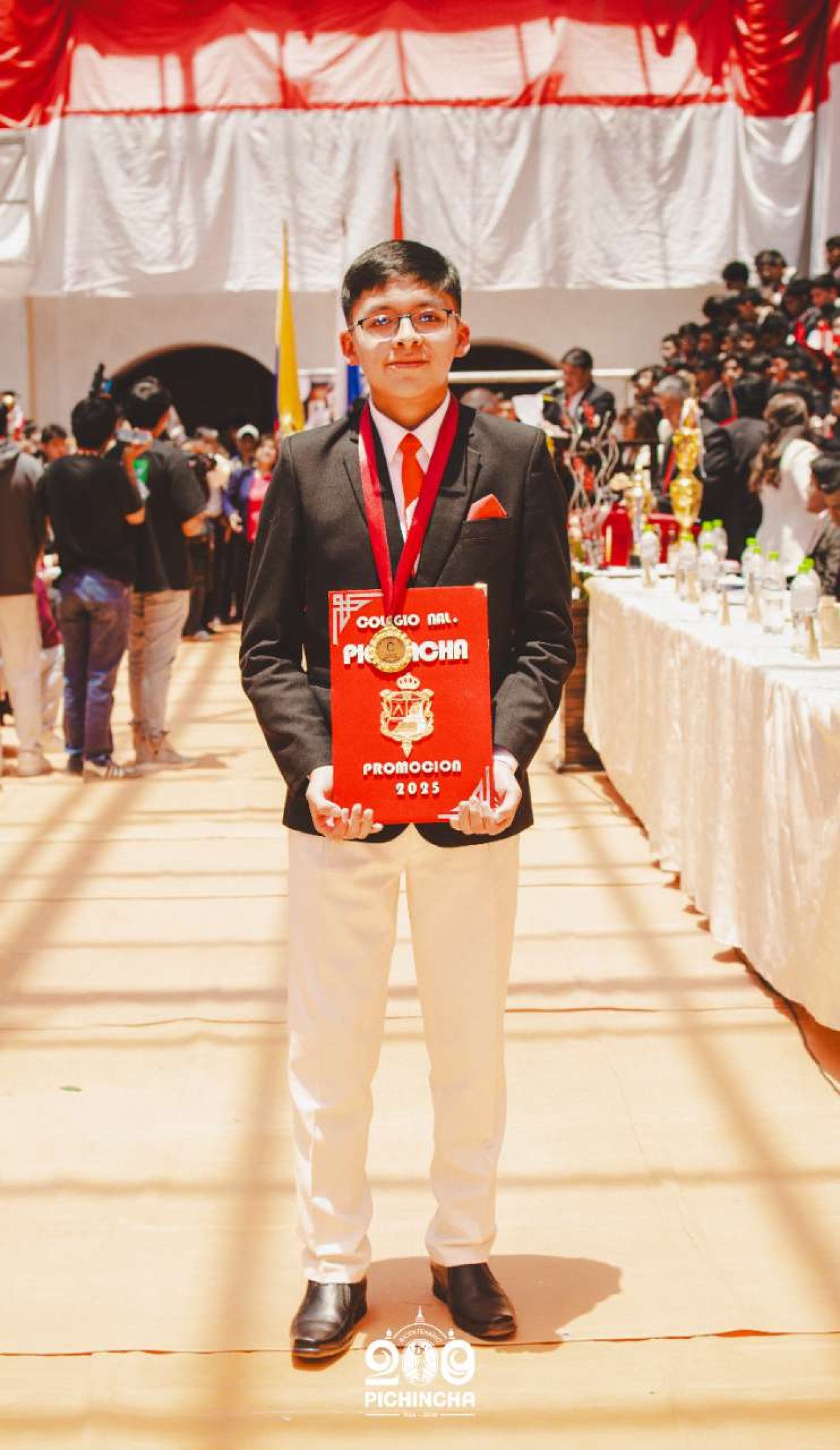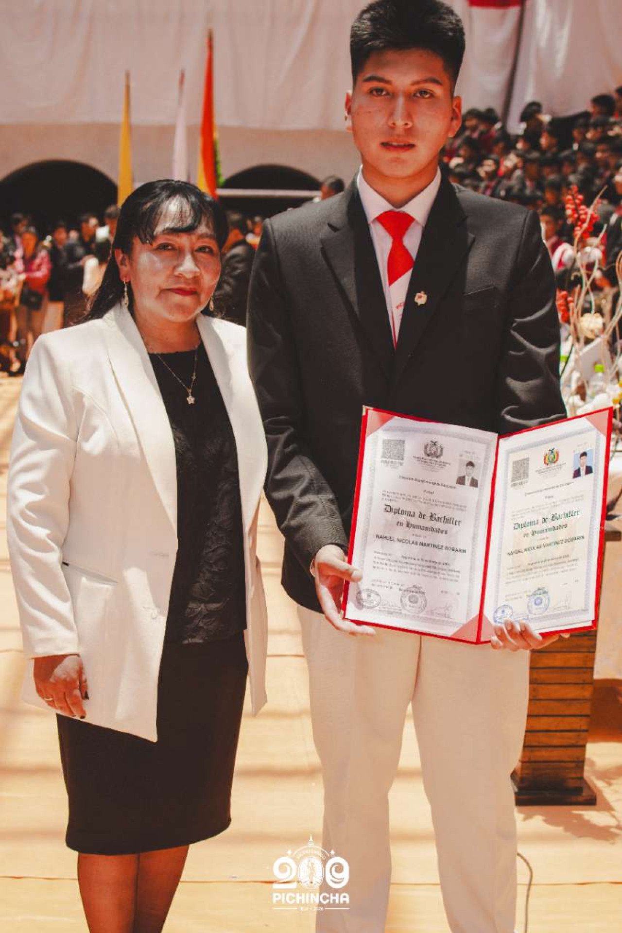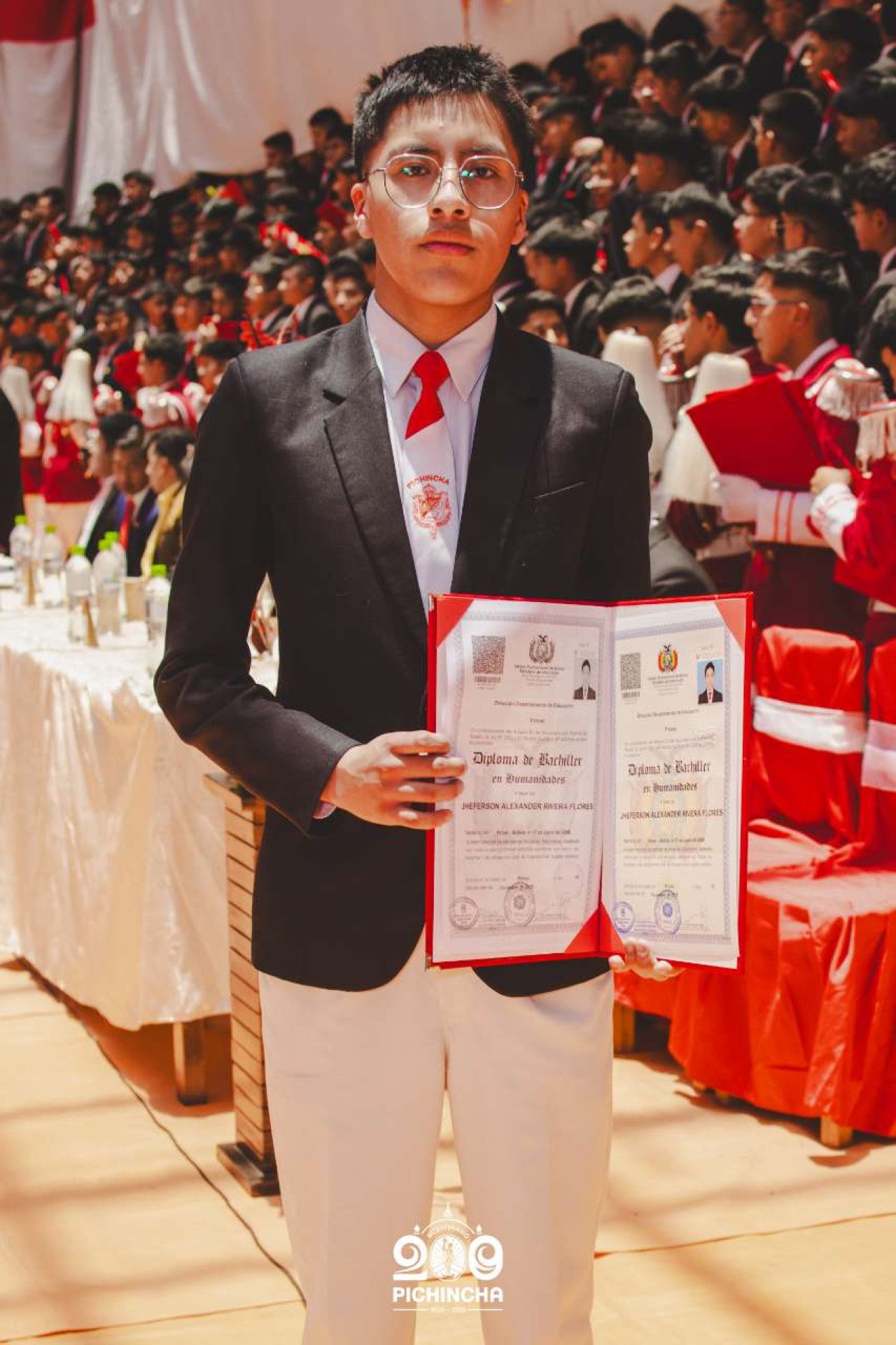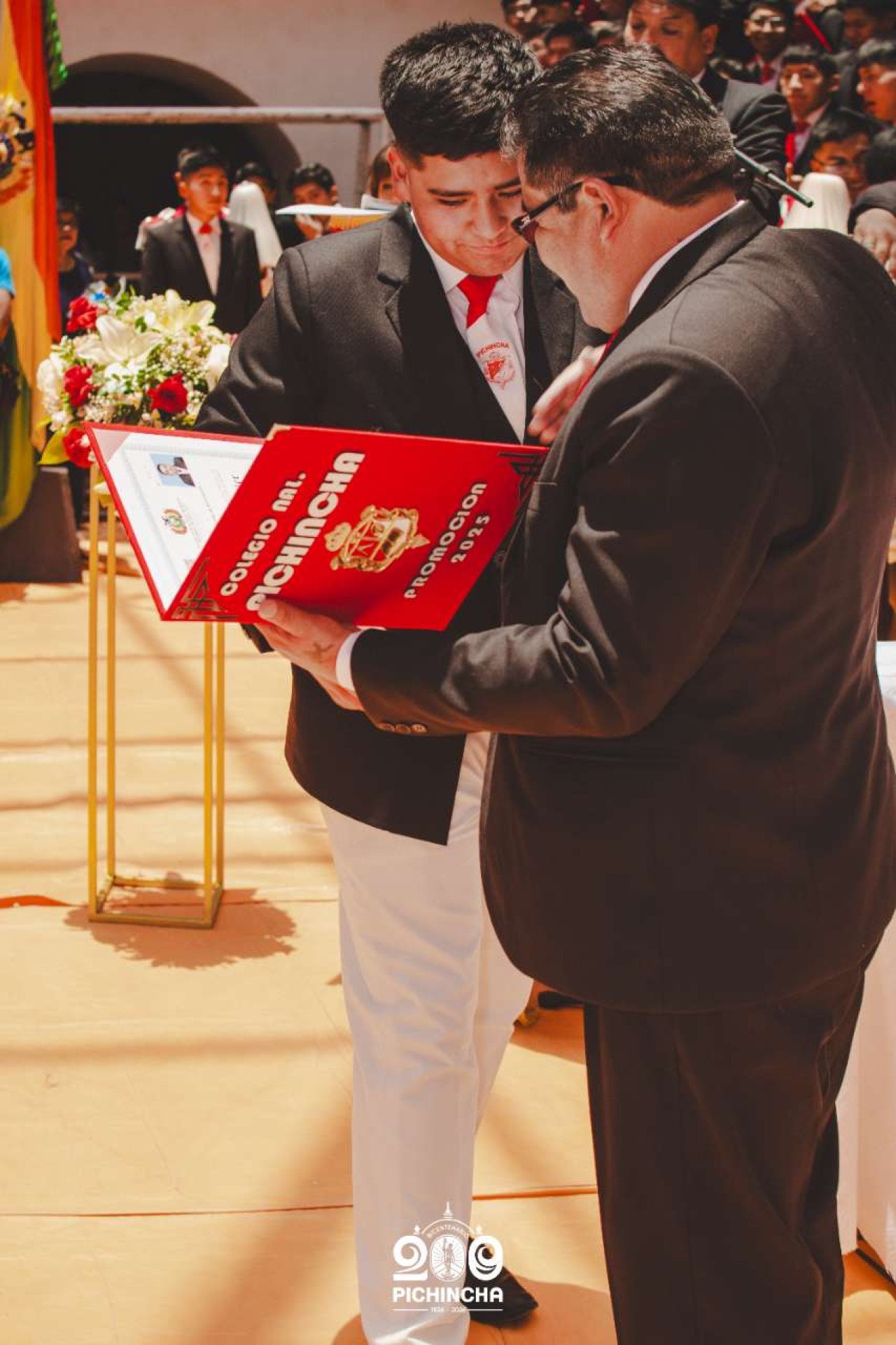 El Colegio Nacional Pichincha presenta las im谩genes de una jornada hist贸rica. Una nueva generaci贸n de bachilleres parte llevando el rojo y blanco y el lema "Constancia y Trabajo" en el coraz贸n.