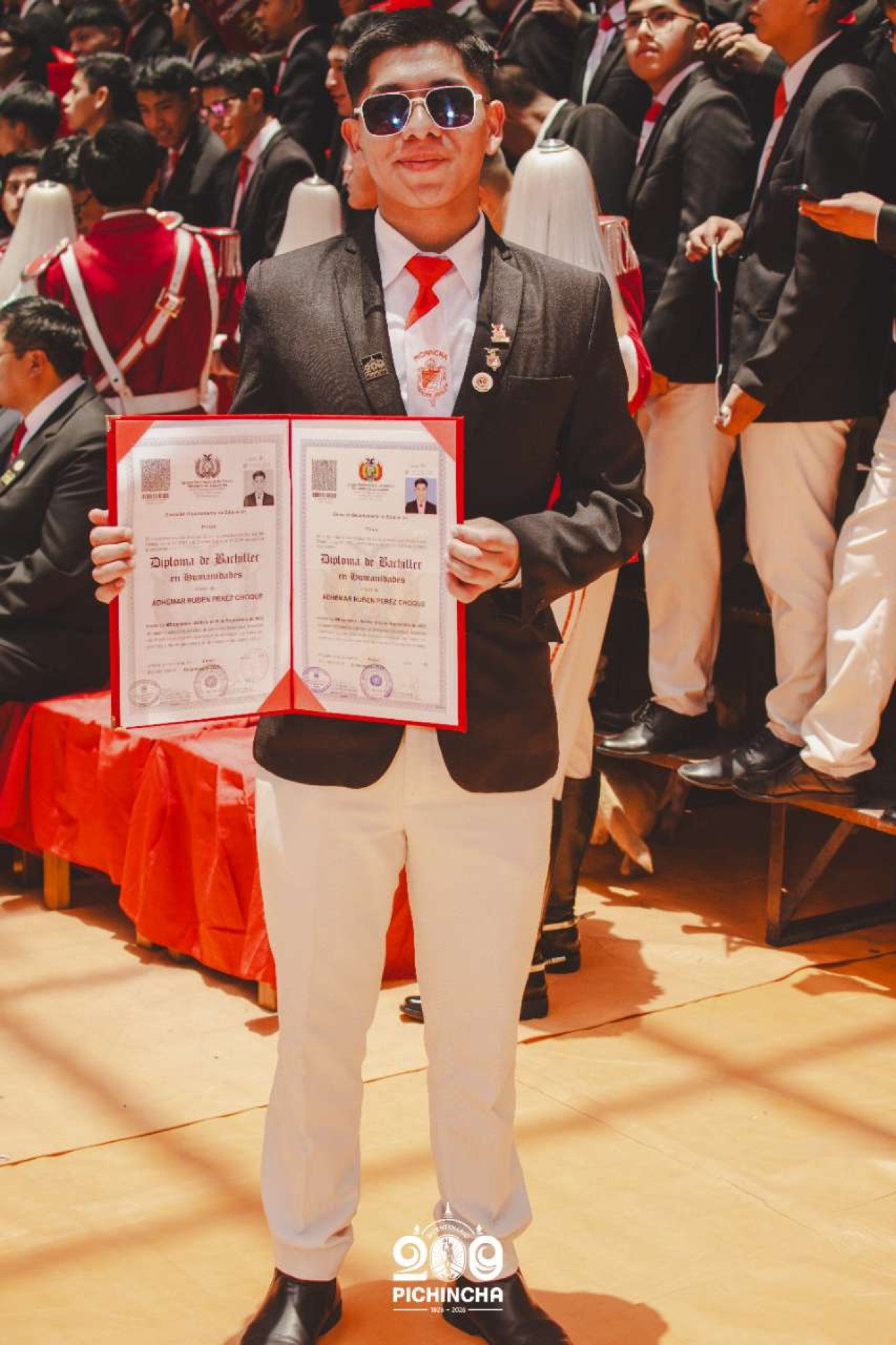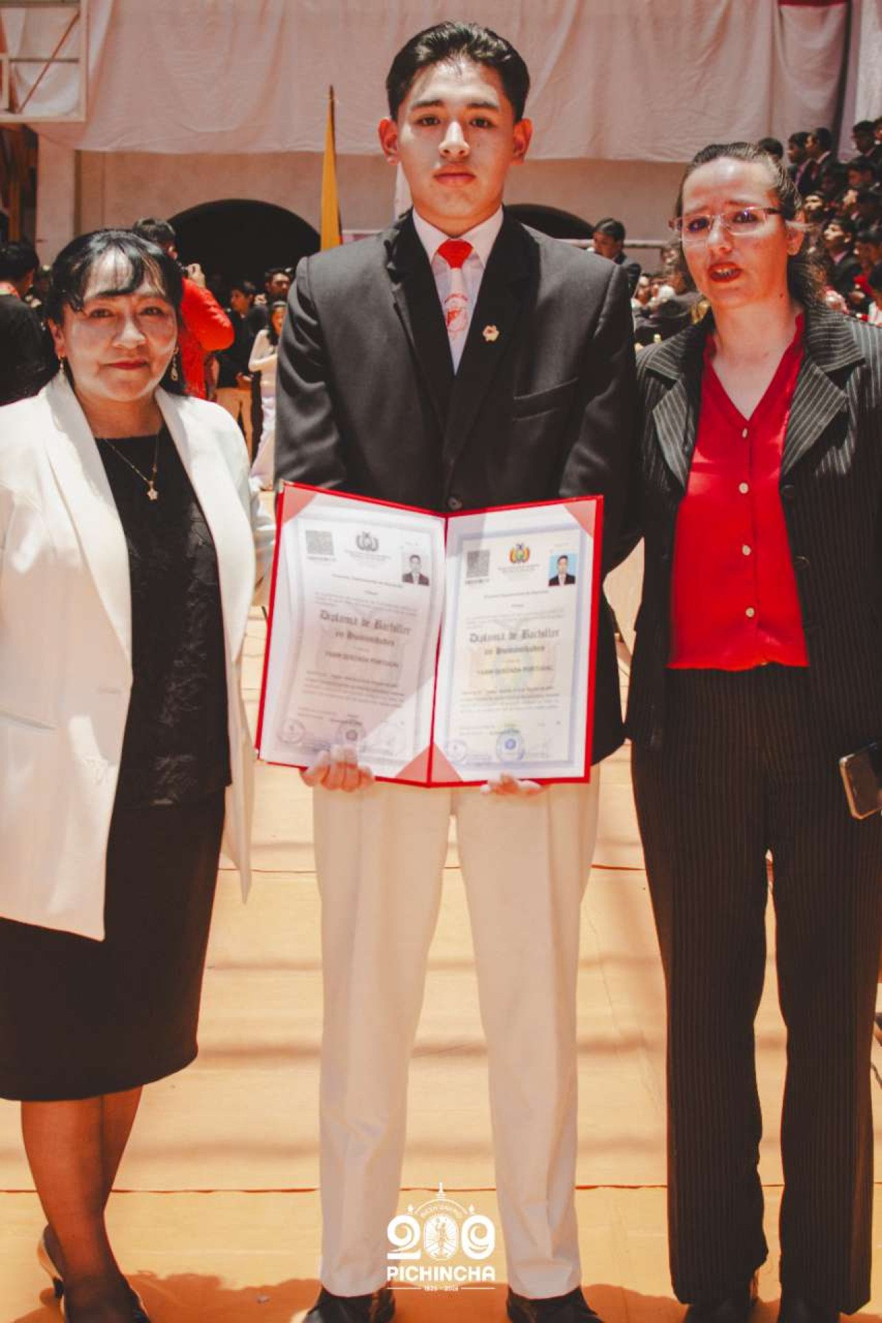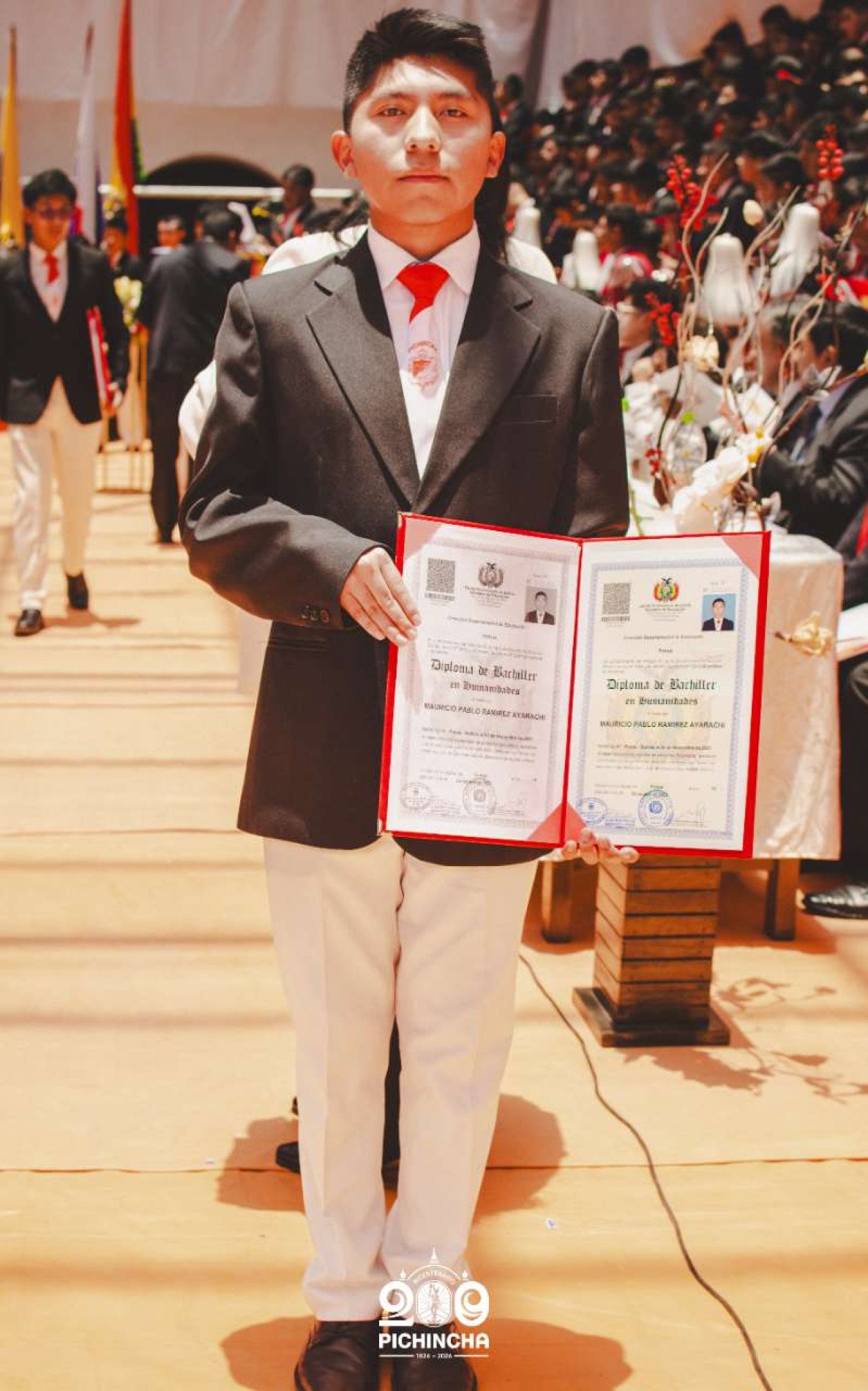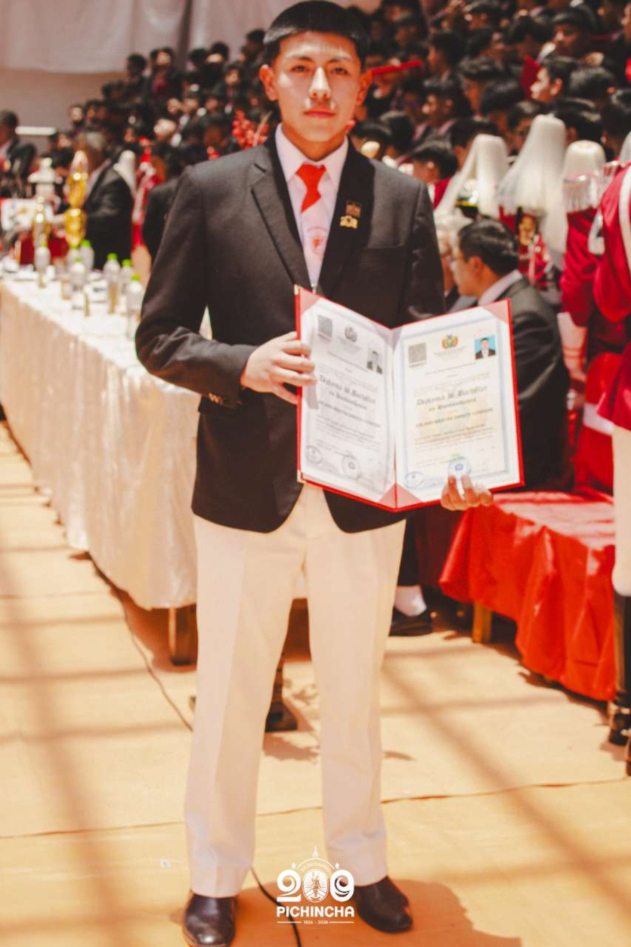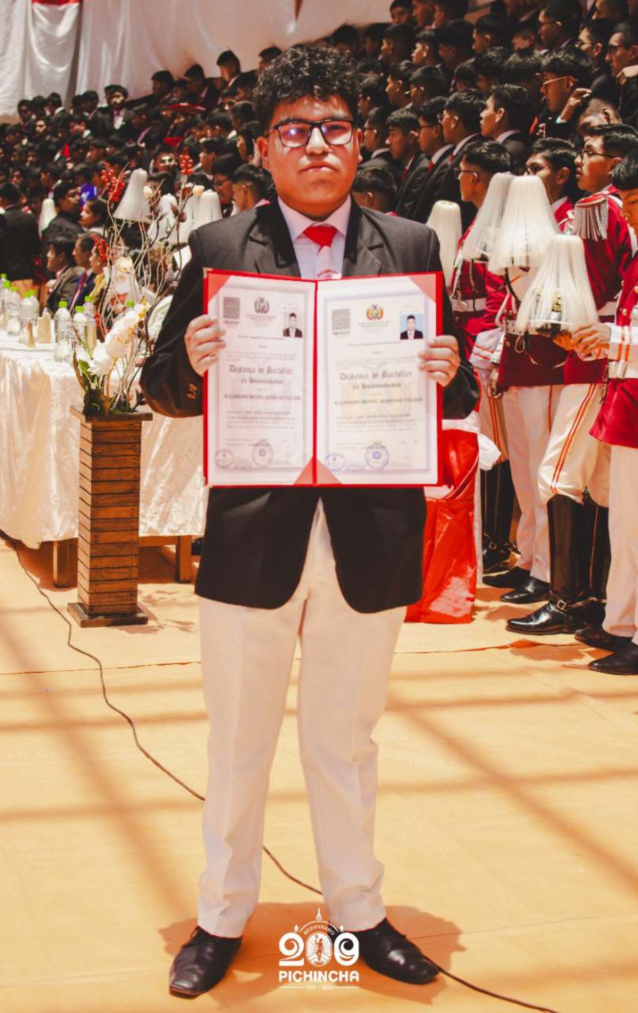 El Colegio Nacional Pichincha presenta las im谩genes de una jornada hist贸rica. Una nueva generaci贸n de bachilleres parte llevando el rojo y blanco y el lema "Constancia y Trabajo" en el coraz贸n.